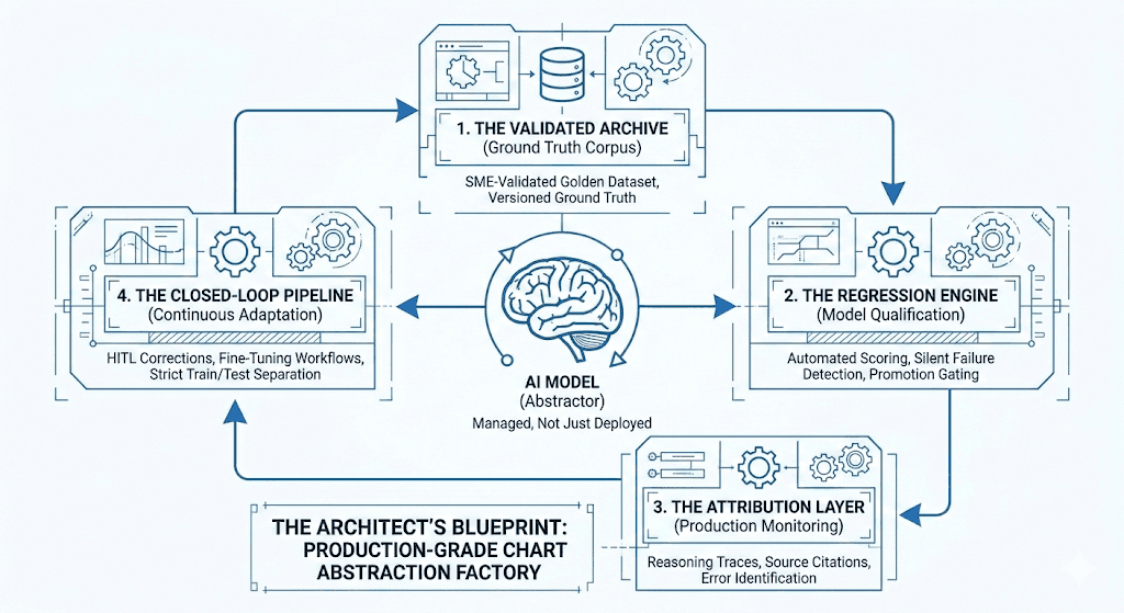 Building a chart abstraction prototype with an LLM takes a weekend. Building a production-grade system that achieves >95% recall, survives a regulatory audit, and handles the "note bloat" of modern EHRs is a multi-year, high resource infrastructure commitment. If you are considering building this internally, this guide outlines the four non-negotiable pillars of a "Data Factory" required to move past the prototype phase and into production reality.